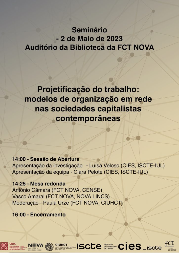 A equipa do projeto PROWORK convida para o Seminário PROWORK – Projectificação do trabalho: modelos de organização em rede nas sociedades capitalistas contemporâneas – que terá lugar na FCT NOVA, Auditório da Biblioteca, no dia 2 de Maio às 14h. Contamos convosco.